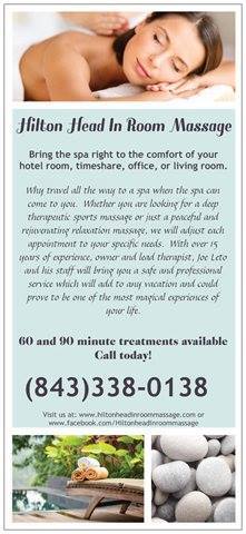 Why travel all the way to a spa when Hilton Head's #1 mobile massage company can bring the spa right to the comfort of your home, hotel room, or vacation rental! If you are a golfer, runner, tennis player, or weekend warrior, Joe Leto, owner and lead therapist, has over 15 years of experience working with professional and amateur athletes across the country and was the most requested therapist at Palmetto Bluff, recently named the top hotel spa in North America. Whether you are looking for a deep therapeutic sports massage or a peaceful and rejuvenating relaxation massage, he and his staff will adjust each treatment to your specific needs. Call today for a safe and professional service which will add to any vacation and could prove to be one of the most magical experiences of your life!.